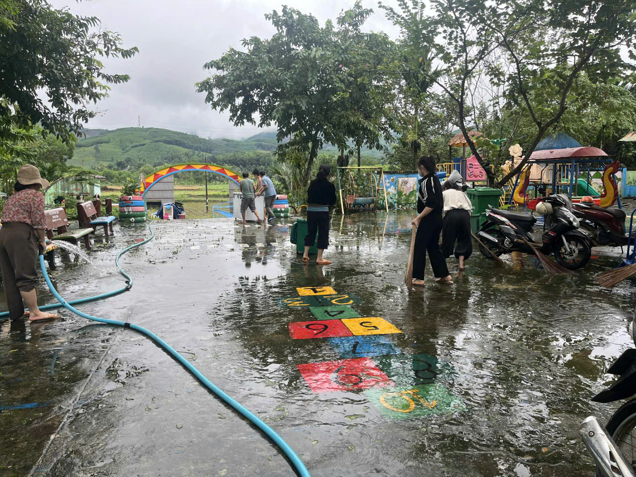 Ngay sau khi thời tiết tạm ổn định, các cô giáo đã có mặt tại trường từ rất sớm, cùng nhau thu dọn cây cối ngã đổ, lau dọn phòng học, sắp xếp lại bàn ghế, đồ dùng, đồ chơi bị ướt hoặc hư hỏng do mưa gió. Nhiều giáo viên không quản ngại vất vả, tranh thủ từng giờ để làm sạch lớp, phơi khô đồ dùng học tập, trang trí lại lớp học, tạo không gian thân thiện, an toàn để sớm đón trẻ trở lại trường.